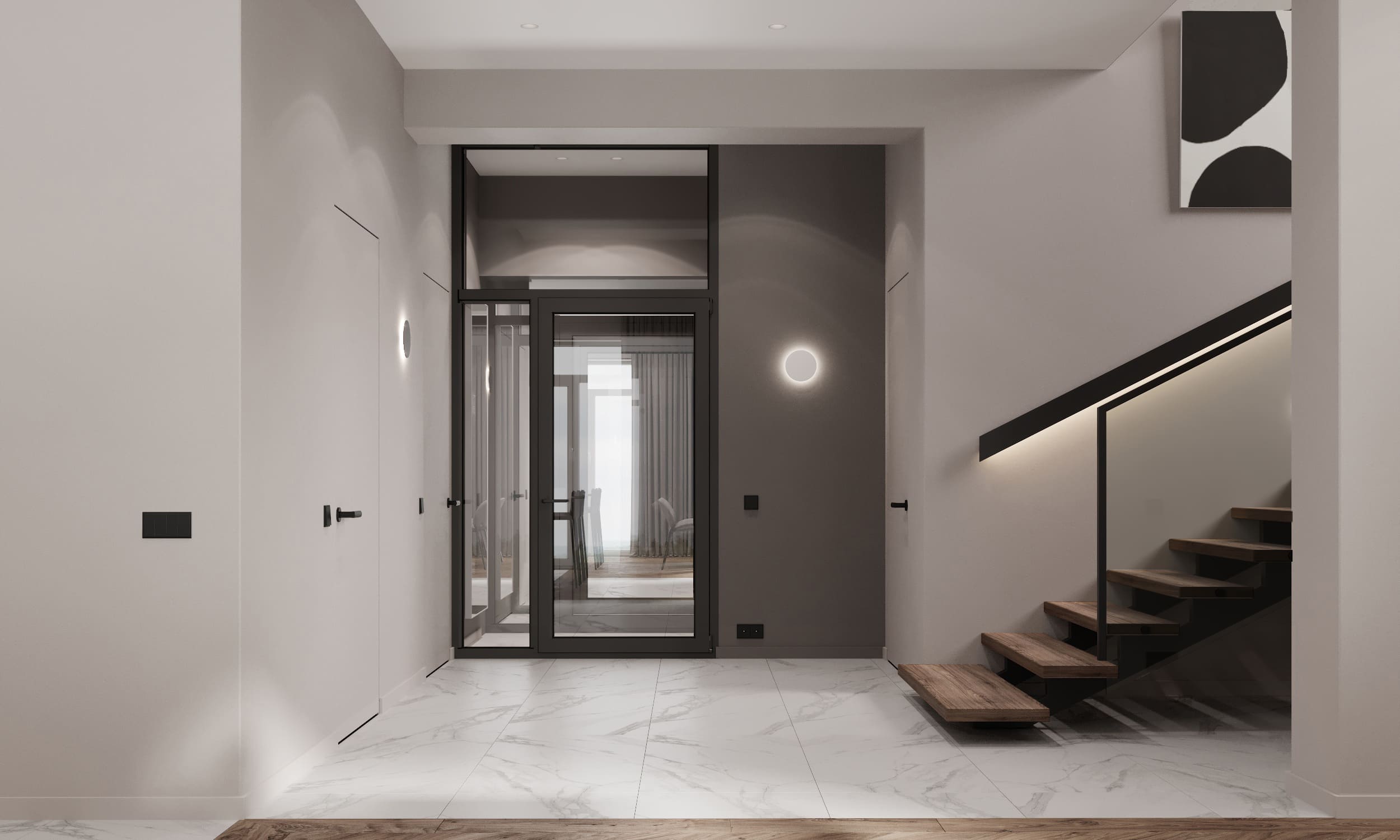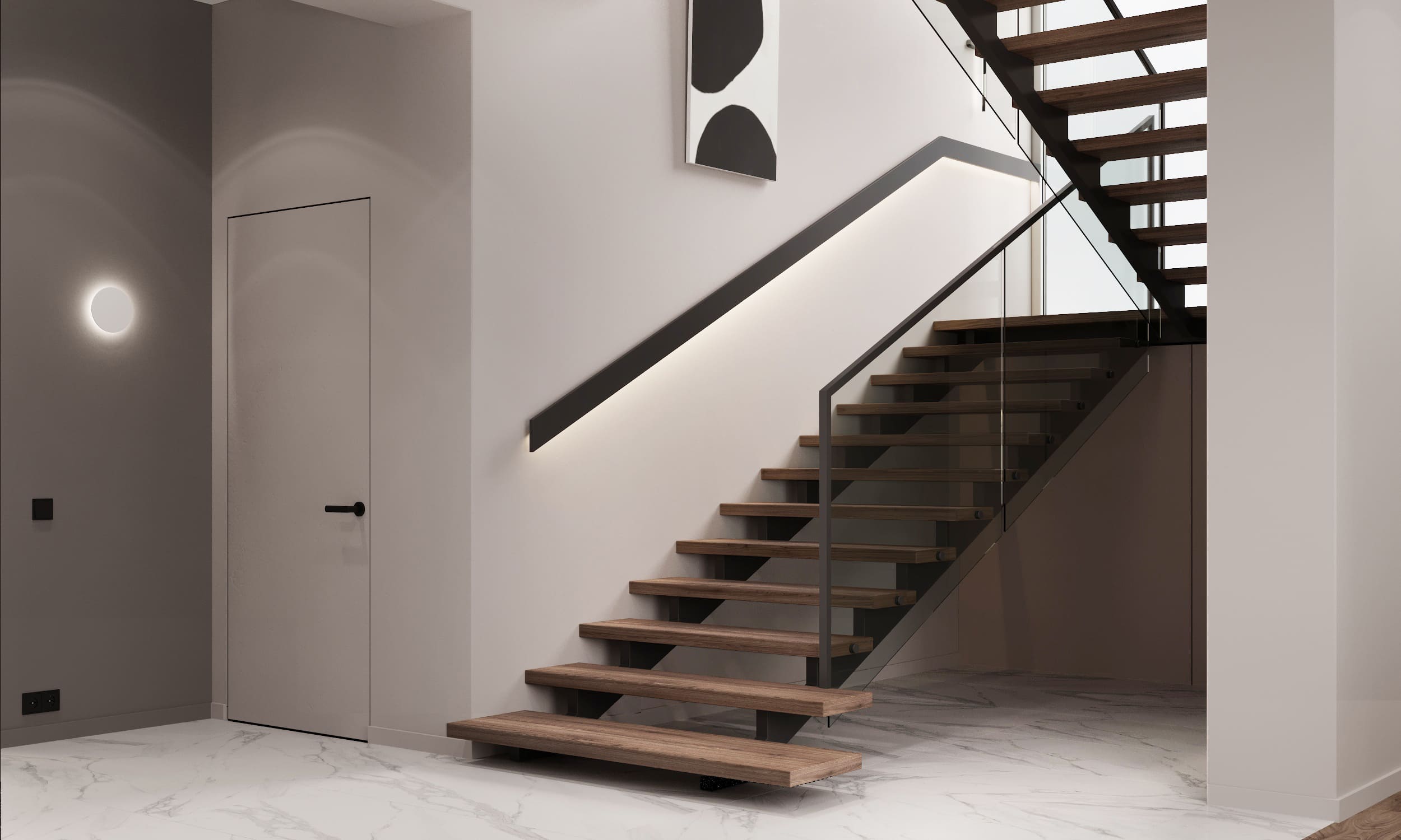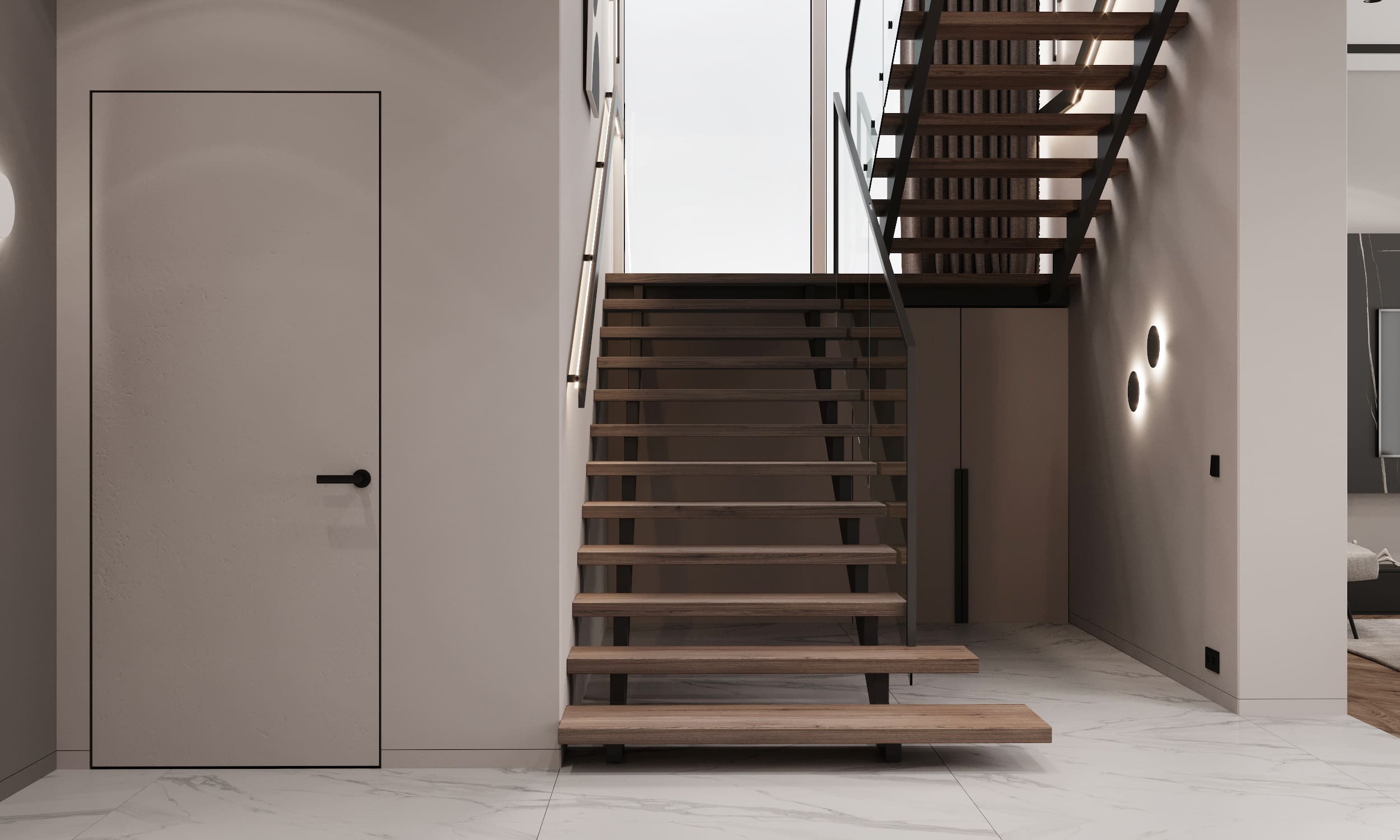 Заказчики любят загородный отдых и хотели ощущать близость к природе. Для этого в интерьере были использованы натуральные материалы, такие как дерево и камень. Так, вы можете видеть деревянную лестницу, ведущую на второй этаж.
