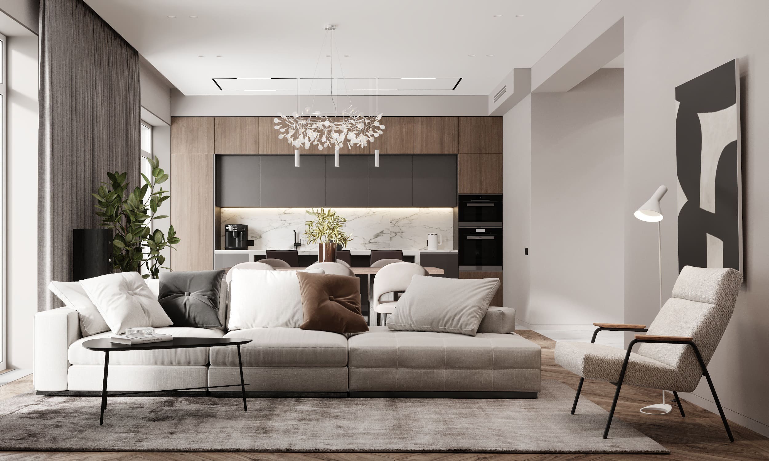 Пространство не хотелось загромождать ни цветом, ни тяжёлыми объёмами, поэтому все стены однотонно-светлые, а мебель спокойных оттенков.